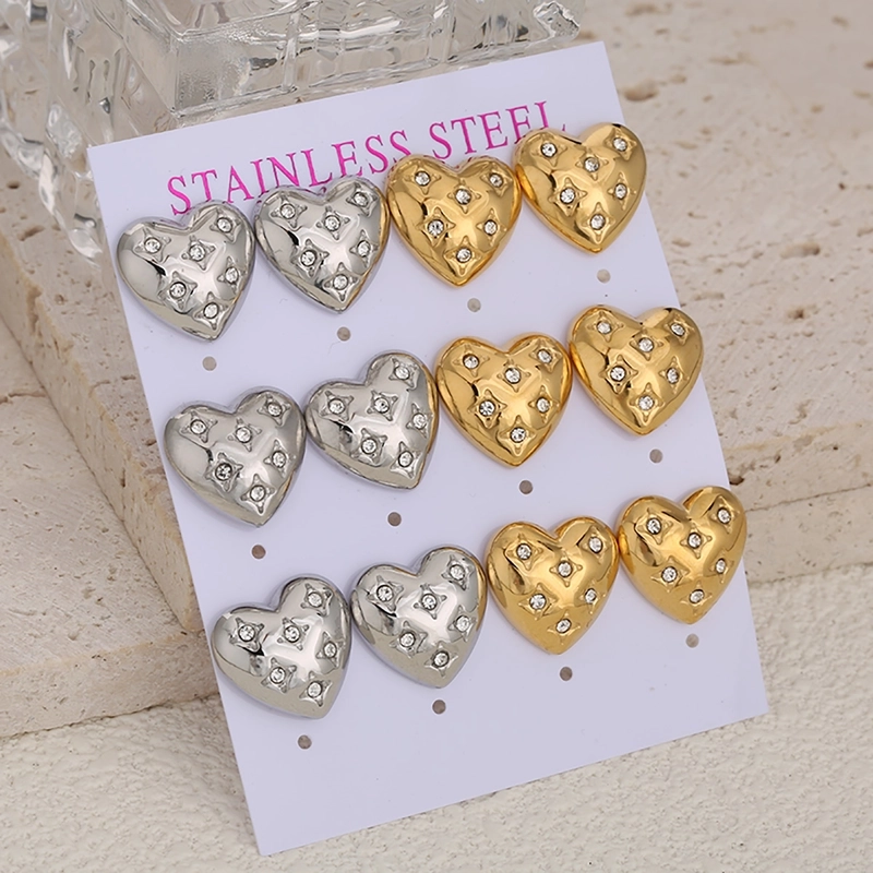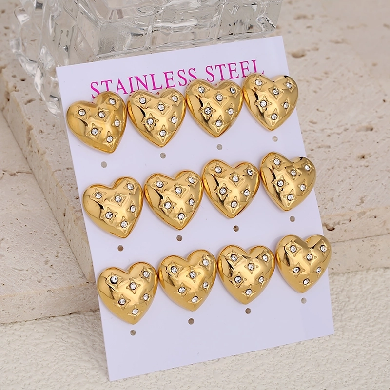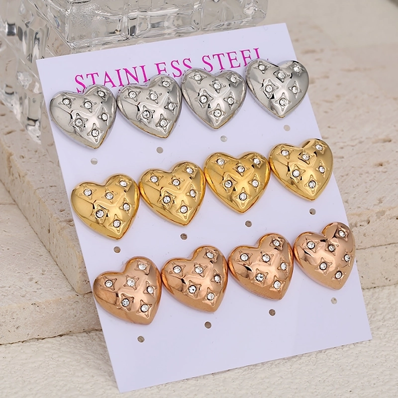 1 Set Of 6 Pairs Minimalist Conch Heart Shape Inlay 304 Stainless Steel Rhinestones Ear Studs