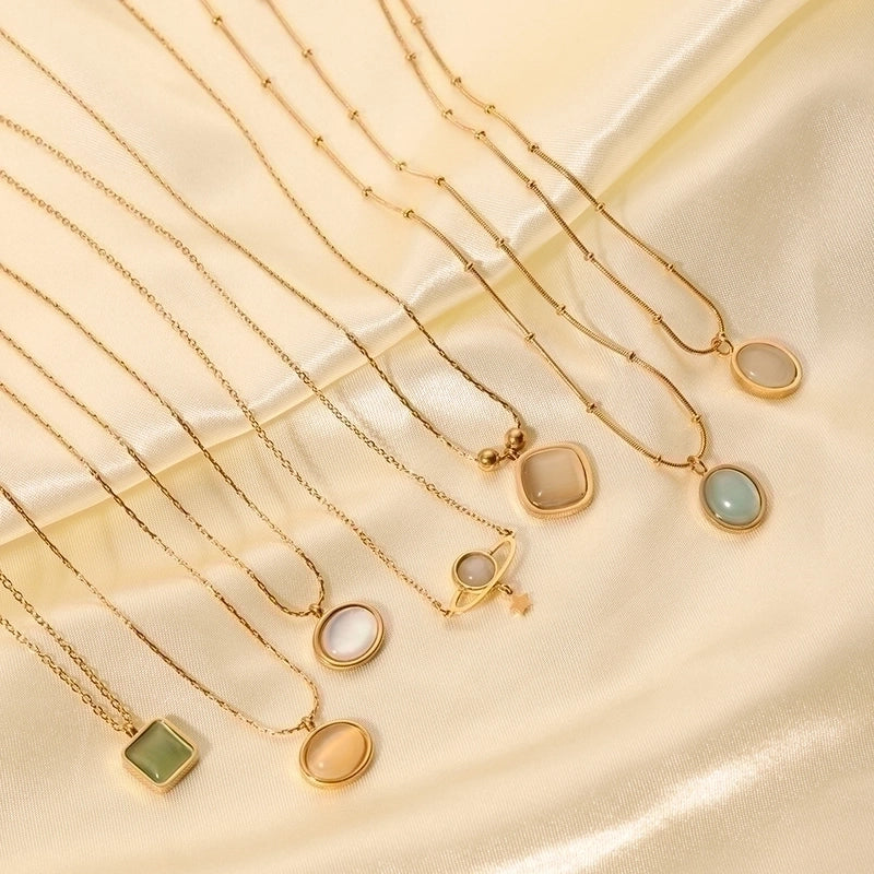 304 Stainless Steel 18K Gold Plated Minimalist Inlay Round Heart Shape Opal Pendant Necklace