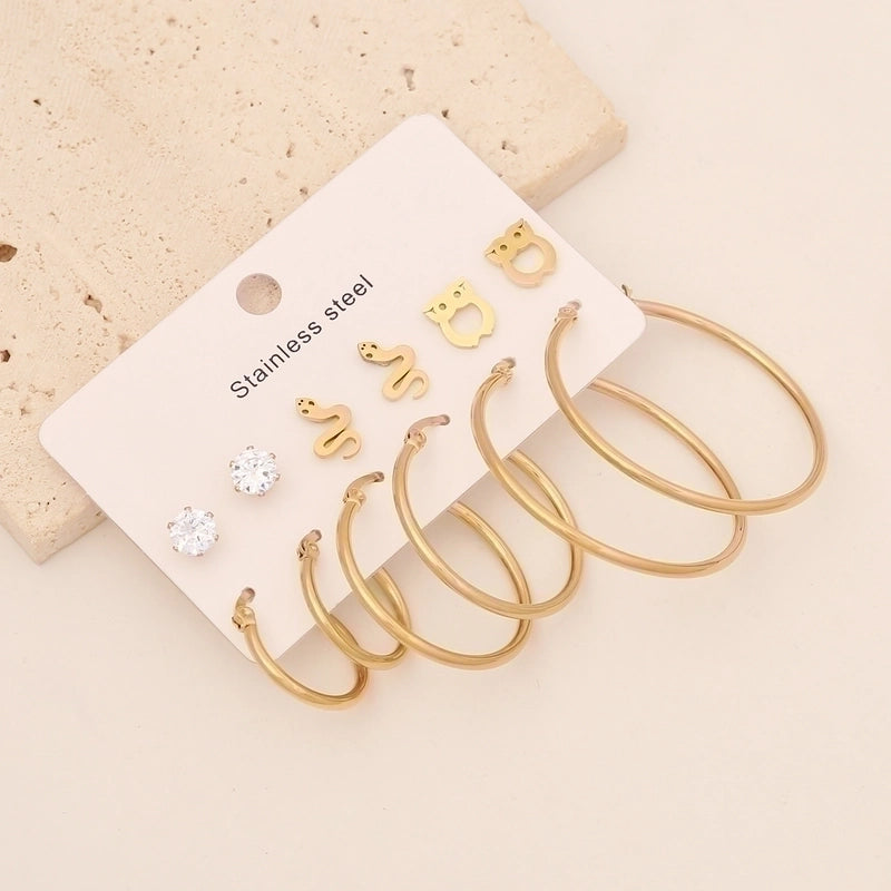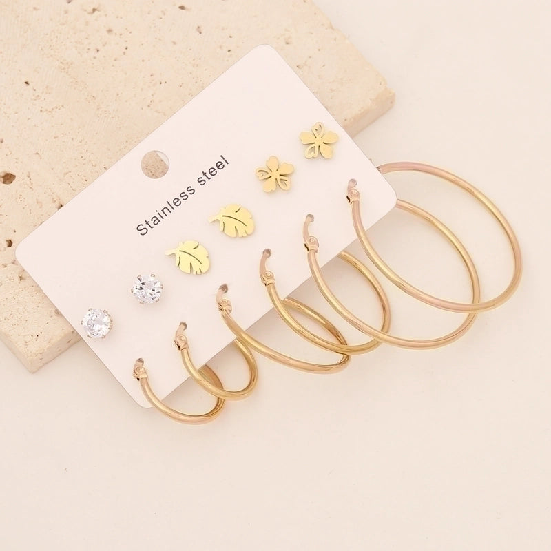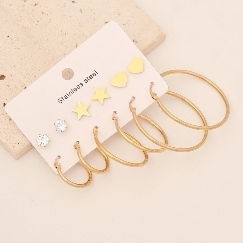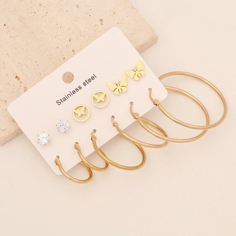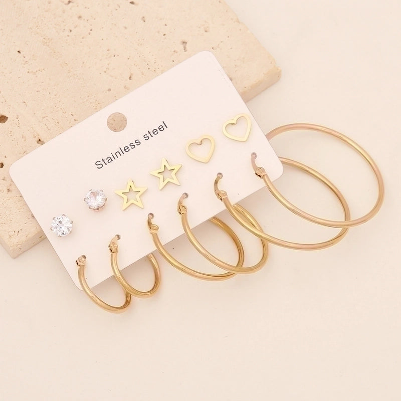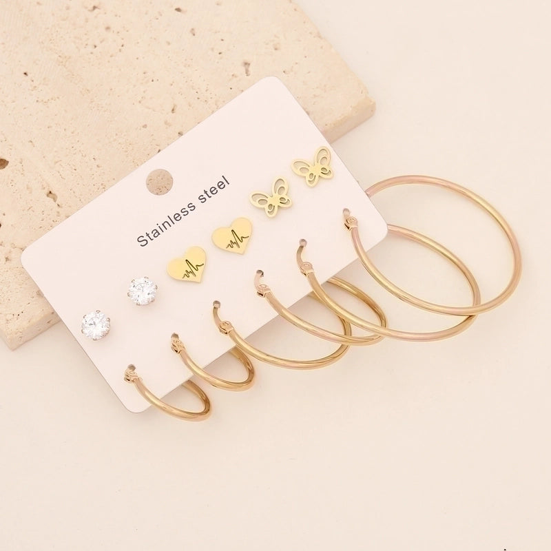 6 Pairs Minimalist Commute Star Heart Shape Butterfly Inlay Stainless Steel Zircon 18K Gold Plated Earrings