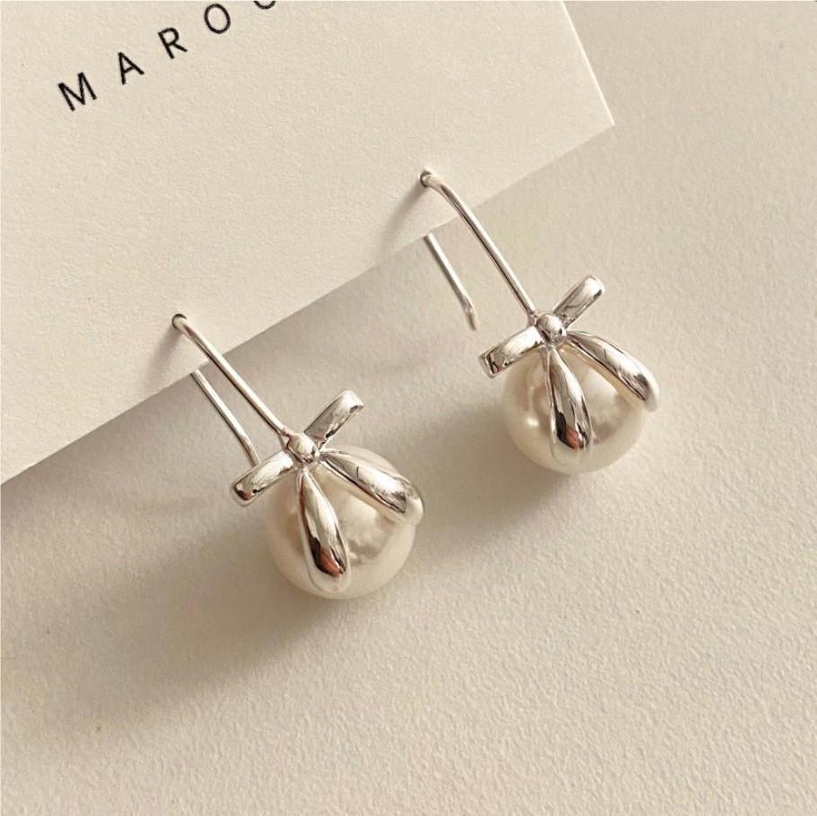 925 Sterling Silver Korean Bowknot Droplet Silver Pearl Inlay Stud Earrings