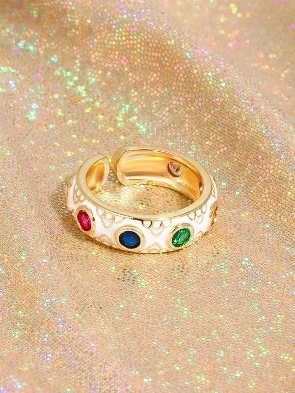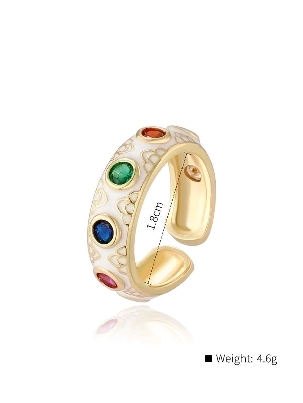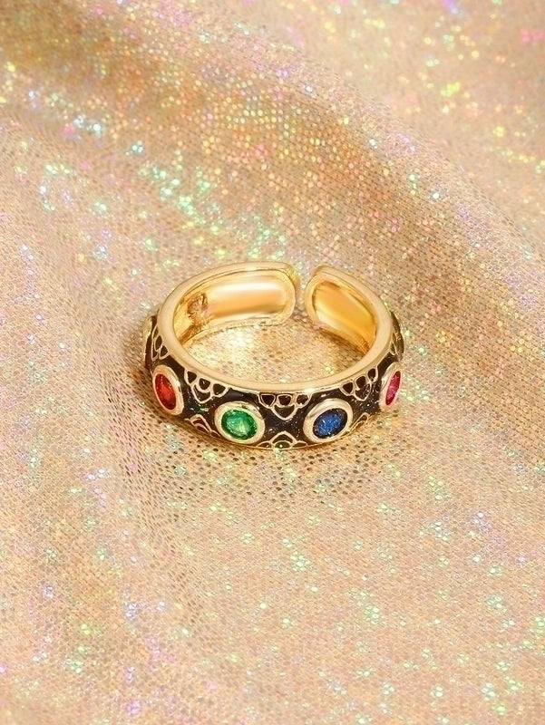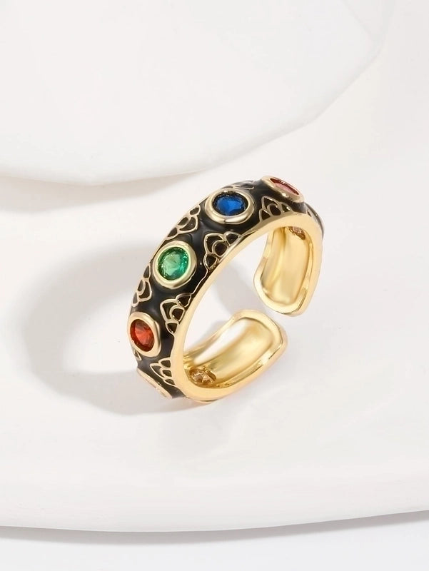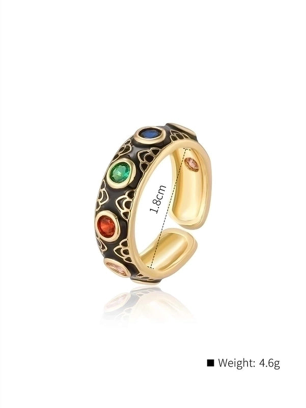 Classical Retro Geometric Copper Enamel Inlay 18K Gold Plated Zircon Open Rings