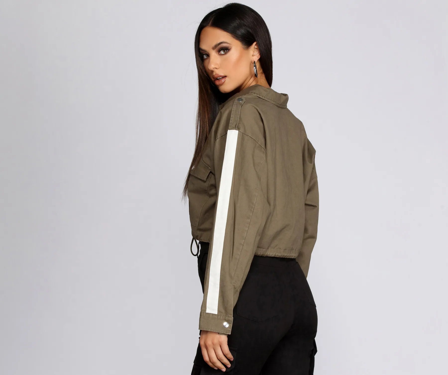 A cropped silhouette lends this utility jacket of-the-moment appeal. Jacket features a standard collar, snap epaulets, long cuffed sleeves with contrast stripe detail, a zip front, two oversize cargo pockets at chest, and a drawstring front hem. Jacket is made from pure cotton with minimal stretch.