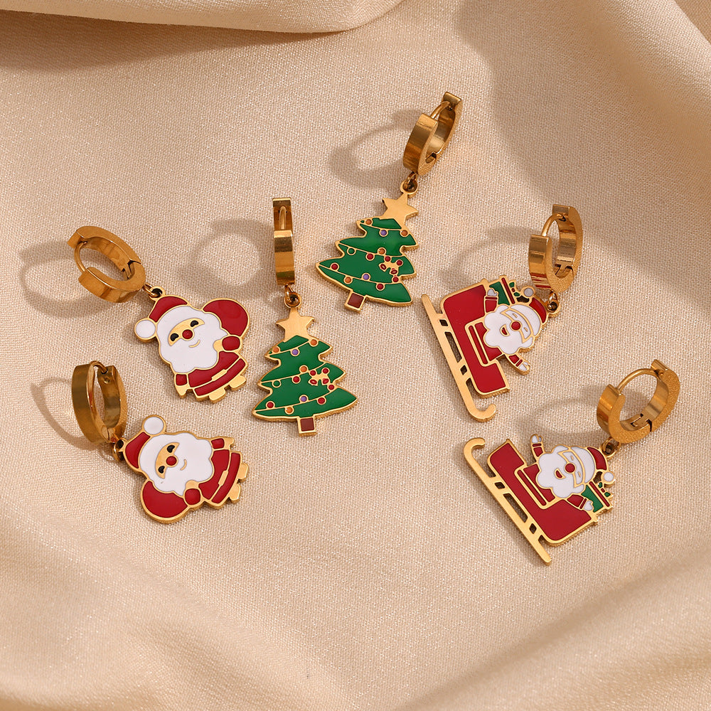 Cute Cartoon Niche Santa Claus Oil Drop Earrings Stainless Steel 18K Gold Plated Sleigh Christmas Tree Earrings
