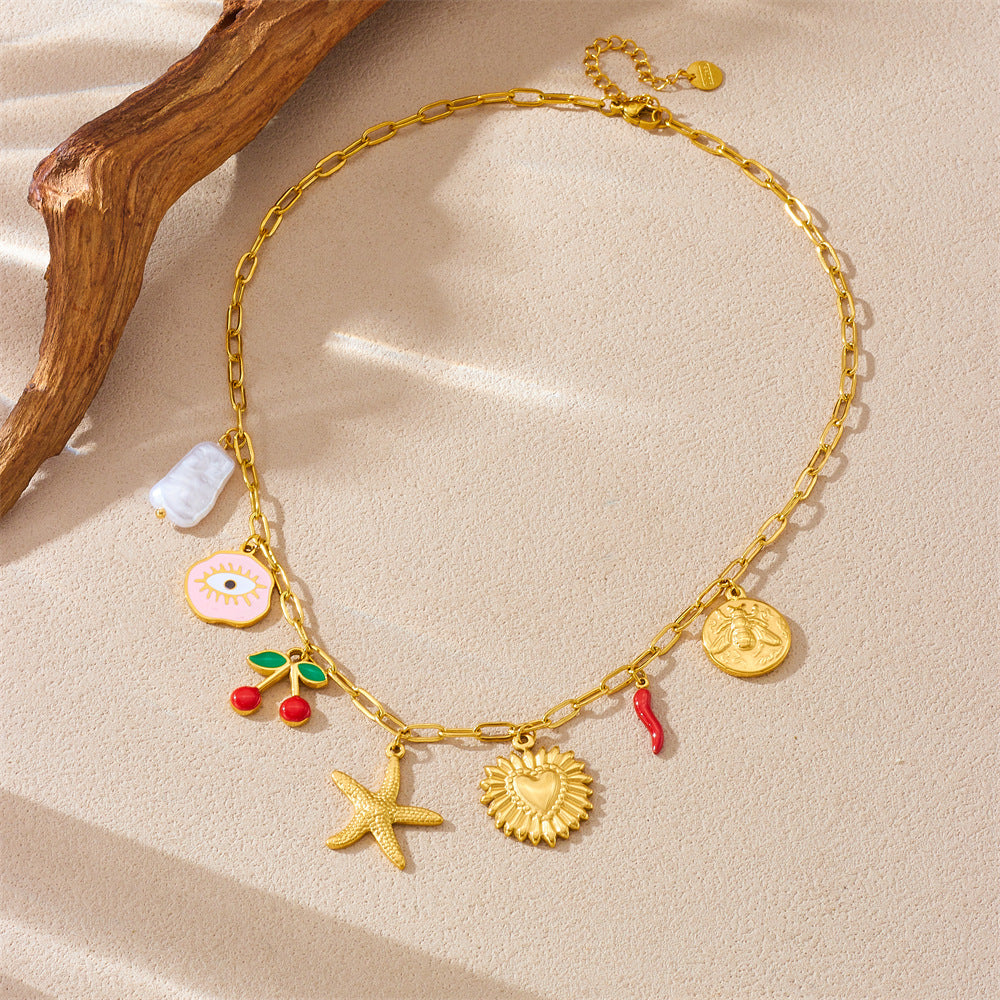 Fashion Cartoon Fruit Cherry Oil Drop Pendant Love Eyes Starfish Stainless Steel Chain Women’S Necklace