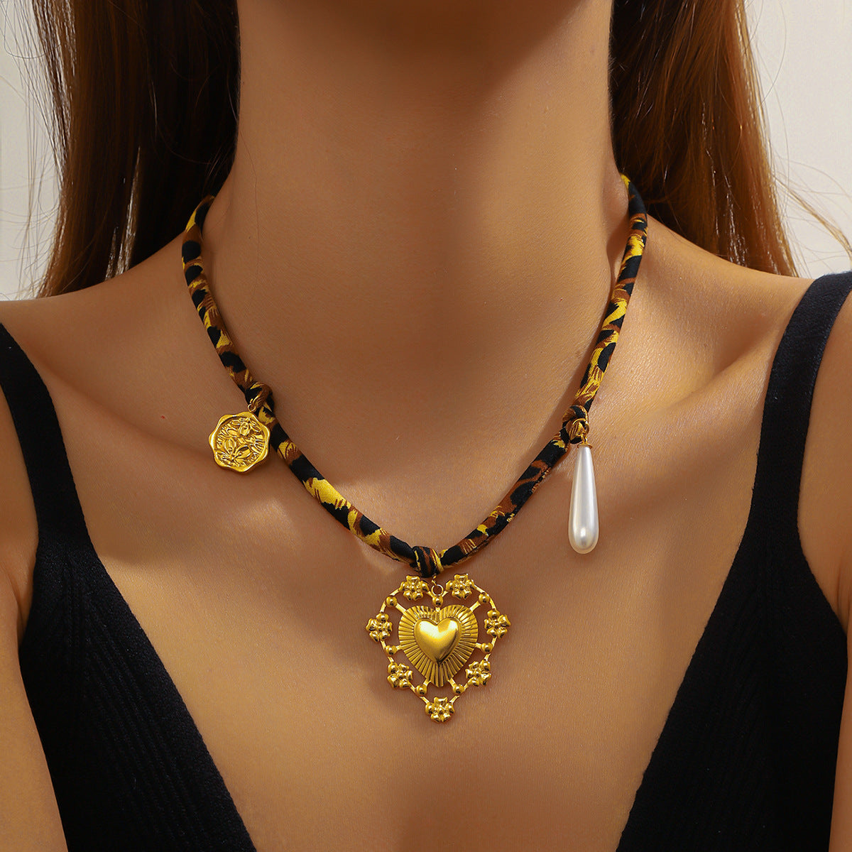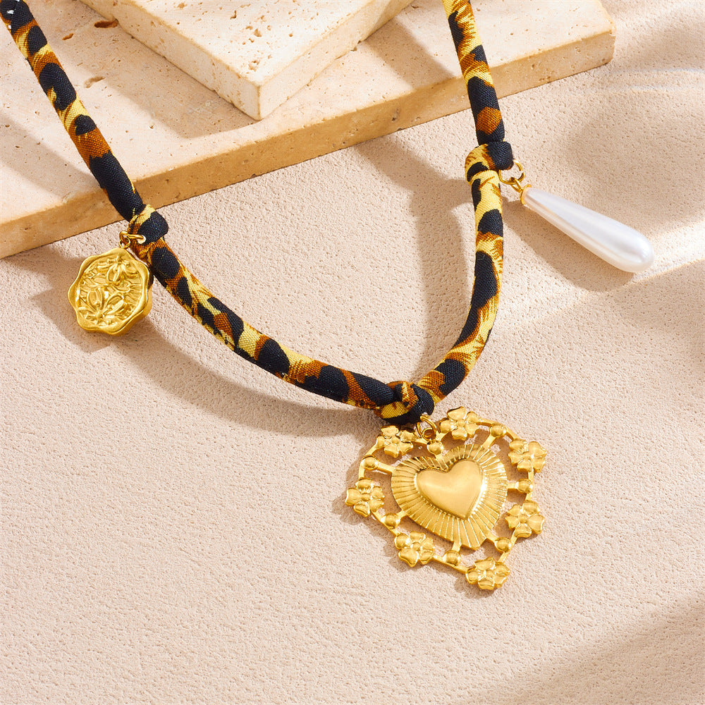 Fashion Pattern Retro Gold-Plated 18K Stainless Steel Flower Heart Pearl Teardrop-Shaped Pendant Necklace