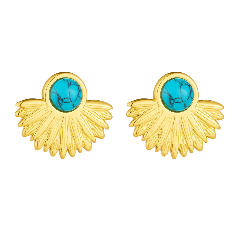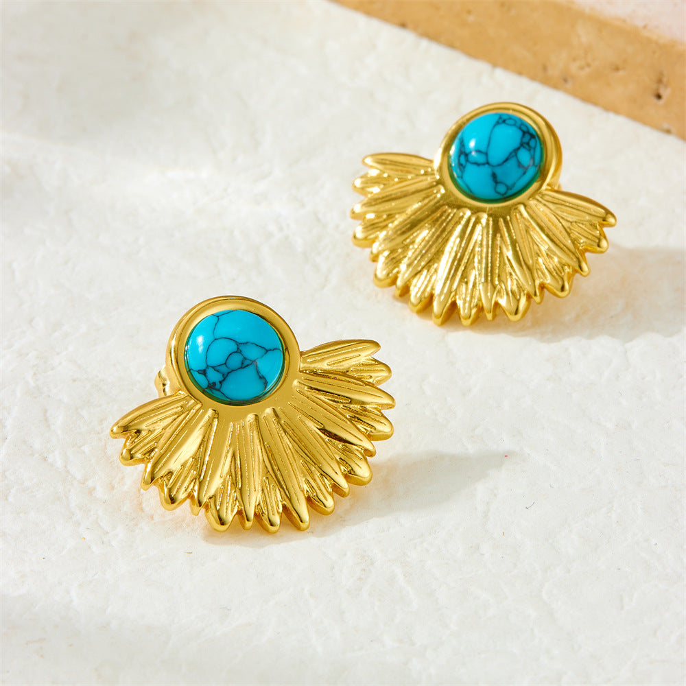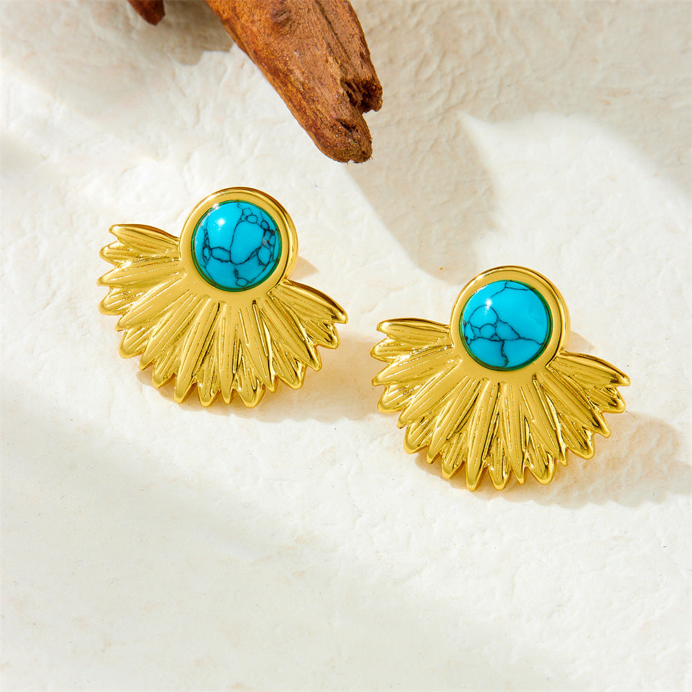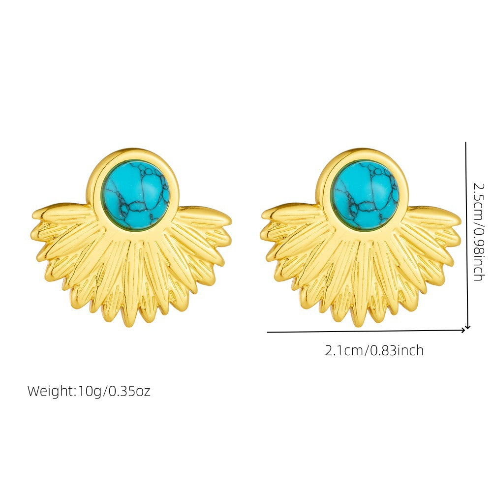 Fashion Retro Design Gold-Plated Inlaid Blue Turquoise Fan-Shaped Accessories Stainless Steel Earrings