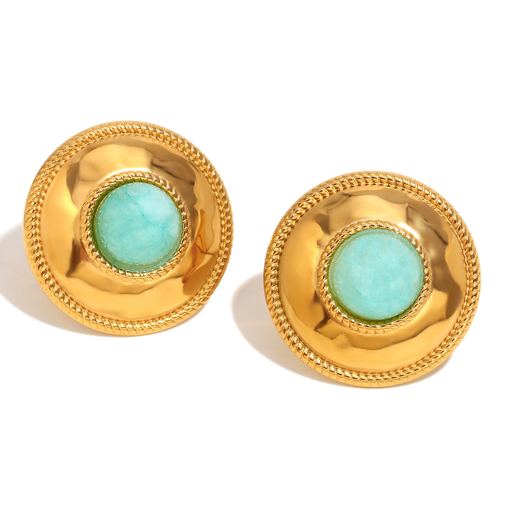 Fashion Retro Geometric French Pattern Earrings Stainless Steel Plated 18K Gold Amazonite Round Earrings