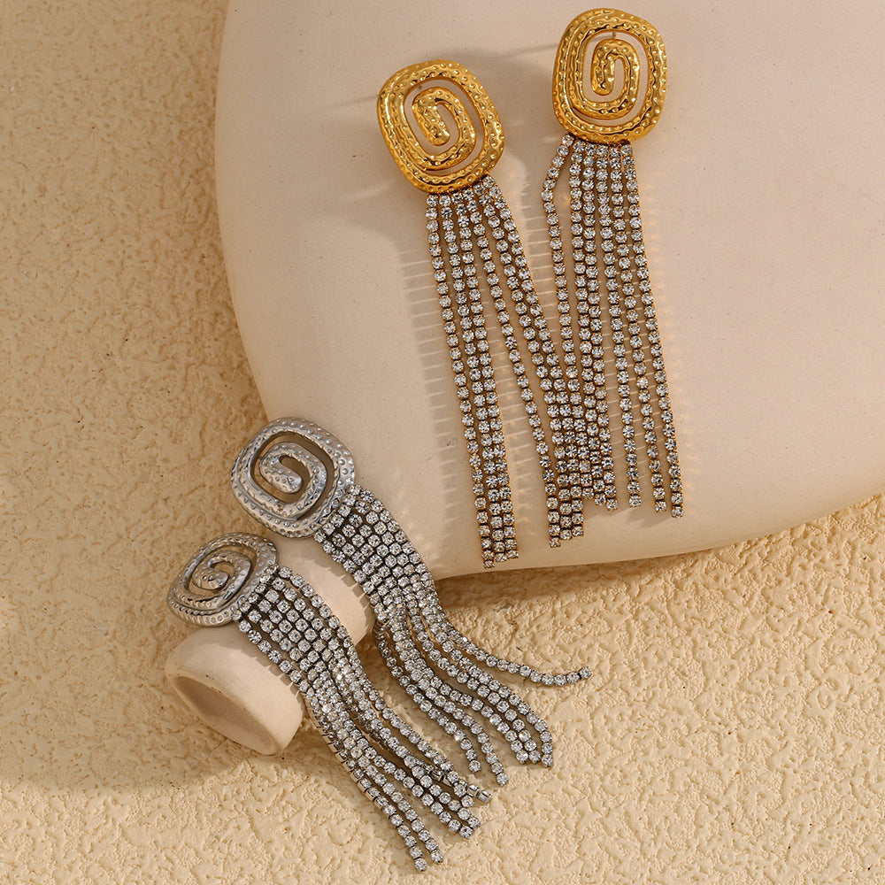 Be the first to review “Fashion Retro Personality Earrings Stainless Steel Plated 18K Gold All-Match Full Diamond Tassel Earrings For Women” Cancel reply