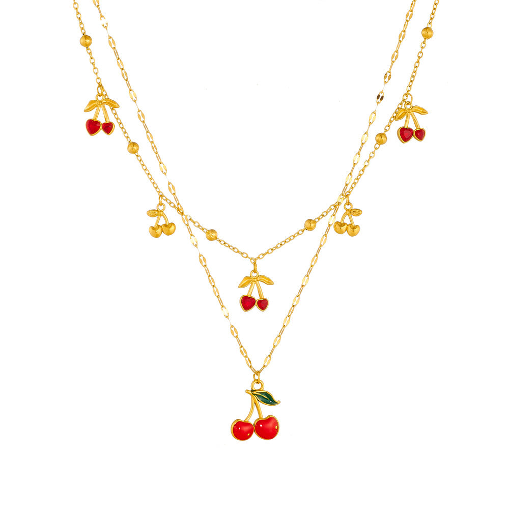 Fashionable Diamond Drop Size Cherry Fruit Pendant Stacking Chain Stainless Steel Gold-Plated Necklace