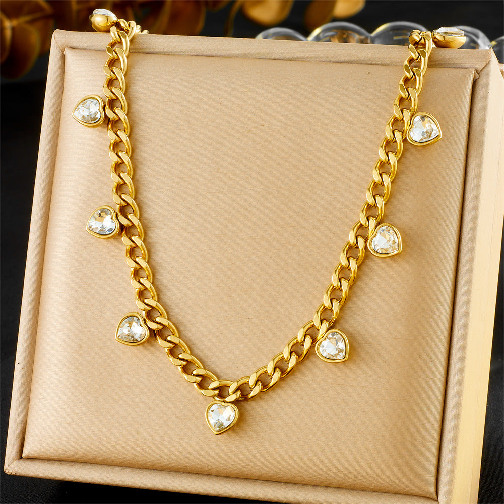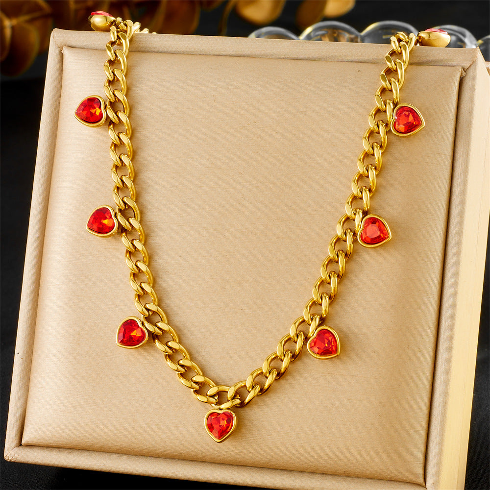 Fashionable Gold-Plated Colorful Heart-Shaped Rhinestone Accessories Stainless Steel Chain Necklace For Women