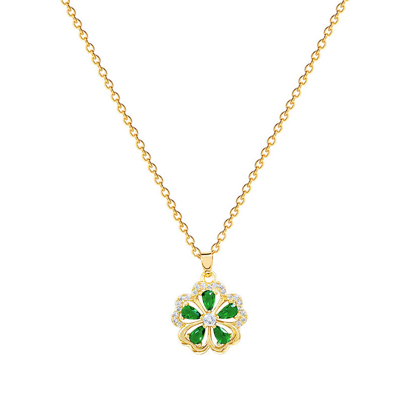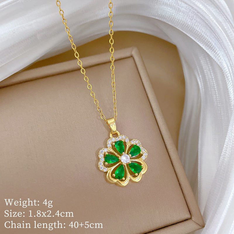 Five-Leaf Flower Green Full Diamond Gorgeous Full Diamond Necklace Female Versatile Clavicle Chain Titanium Steel