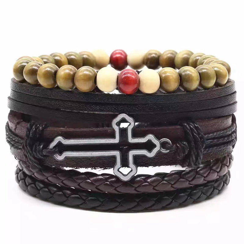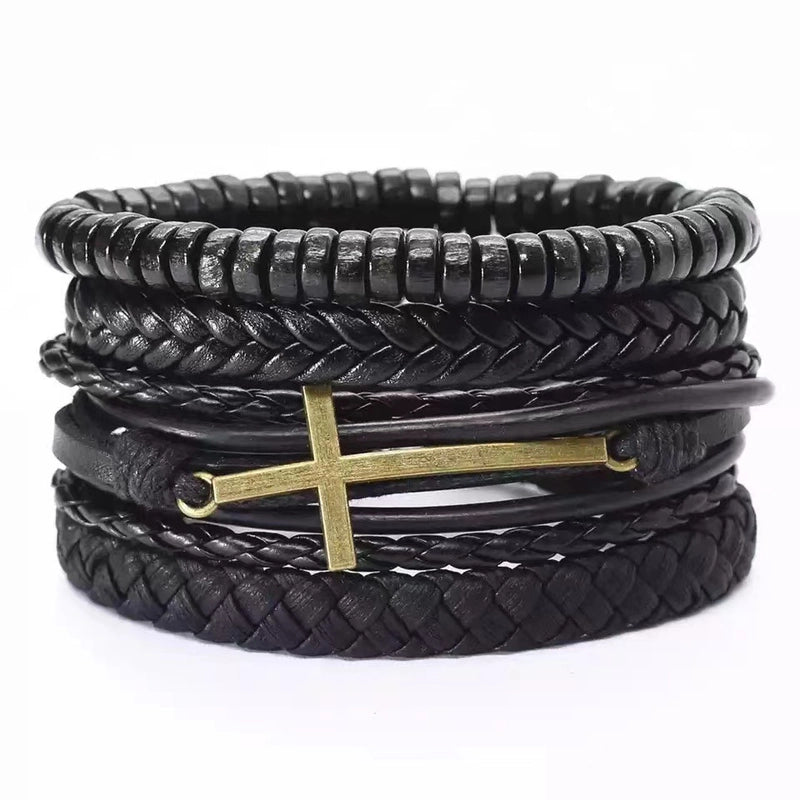 Four-Piece Card Punk Hardware Woven Bracelet Leather Bracelet Multi-Layer Suit Cross Retro Ornament Men’s