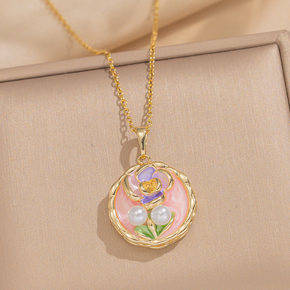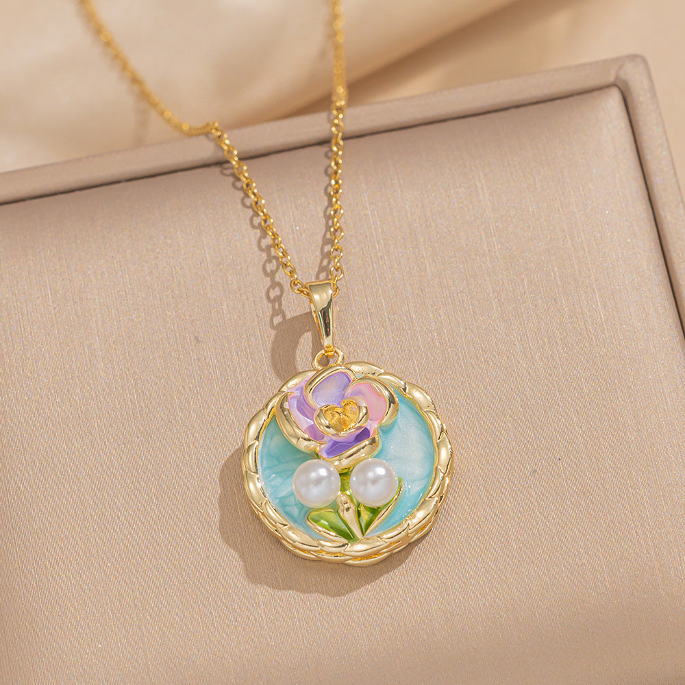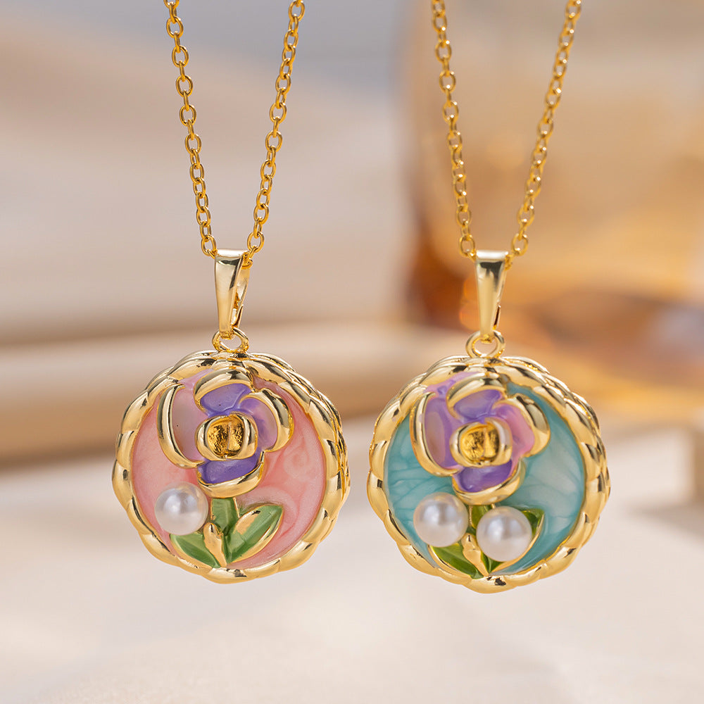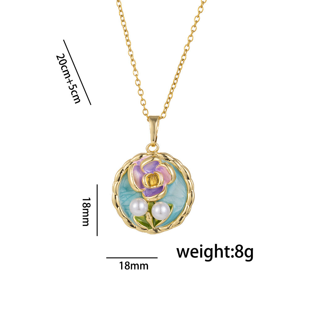 French Retro Oil Drop Baroque Freshwater Pearl Enamel High-Grade Painted Flower Pendant Necklace