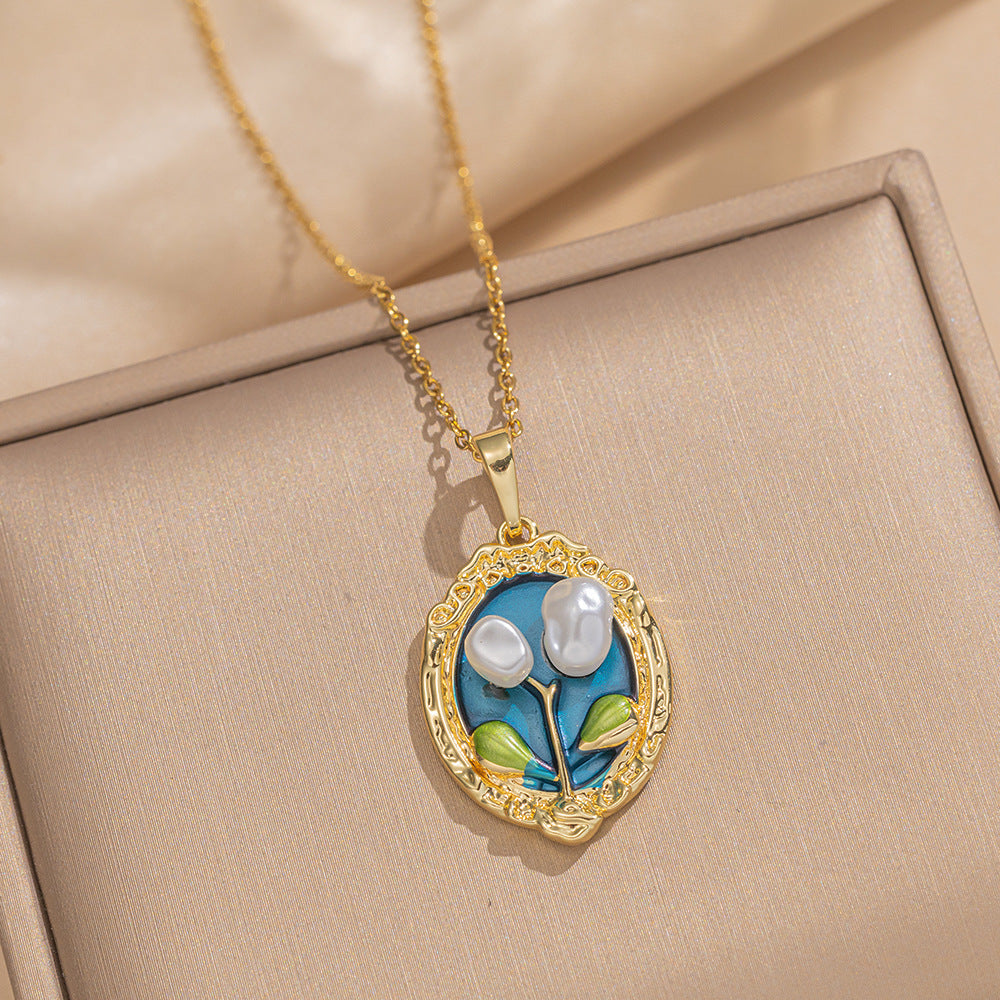 French Retro Oil Drop Baroque Freshwater Pearl Enamel High-Grade Painted Flower Pendant Necklace