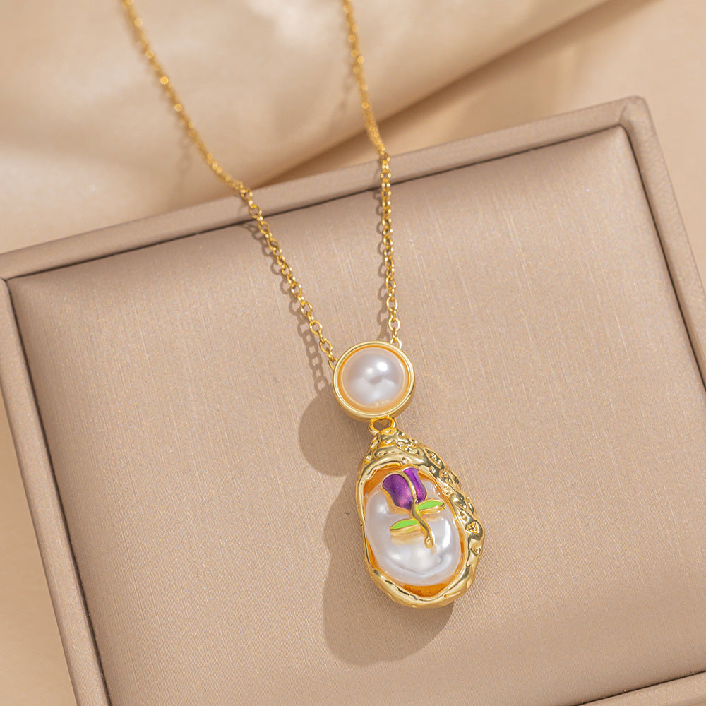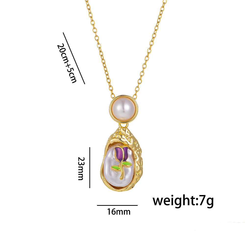 French Retro Oil Drop Baroque Freshwater Pearl Enamel High-Grade Painted Flower Pendant Necklace