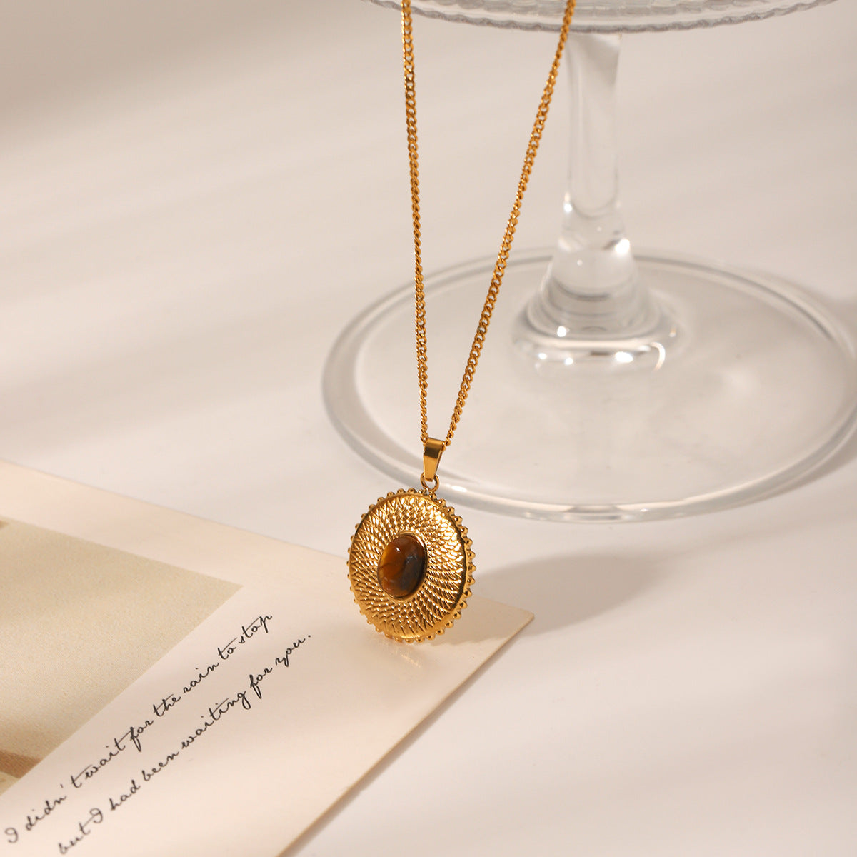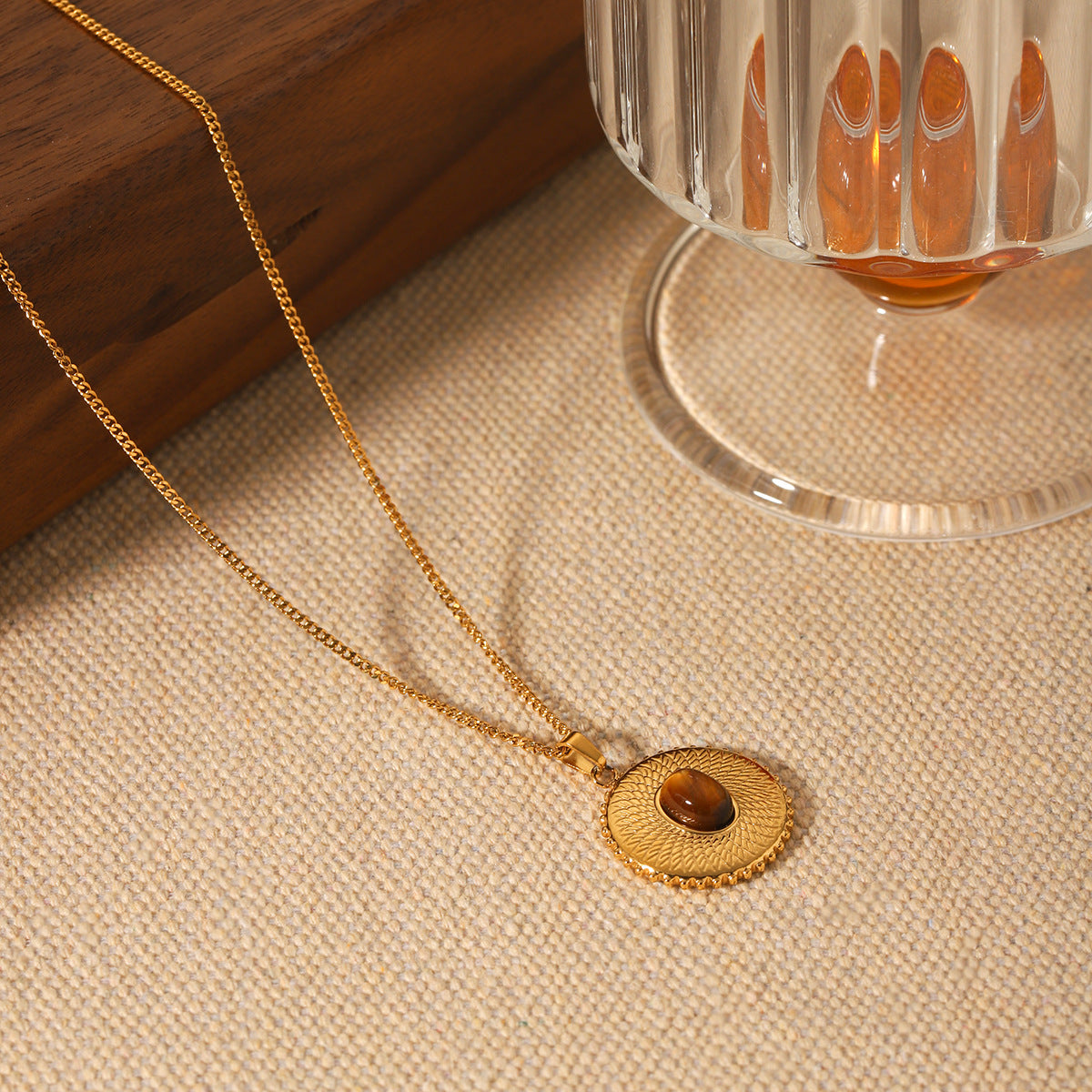 French Retro Round Texture Stainless Steel Inlaid Tiger Eye Stone Pendant Necklace Female Versatile Titanium Steel Necklace