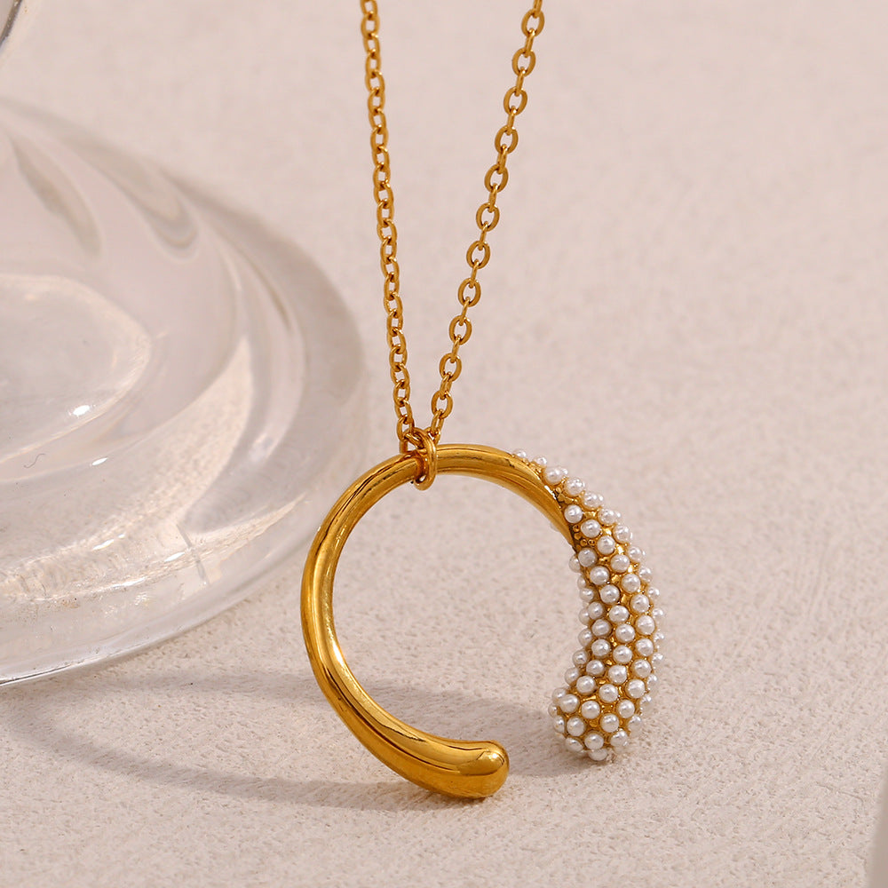 Geometric Fashion Pendant Stainless Steel Plated 18K Gold Half-Inlaid Moon Pendant Necklace