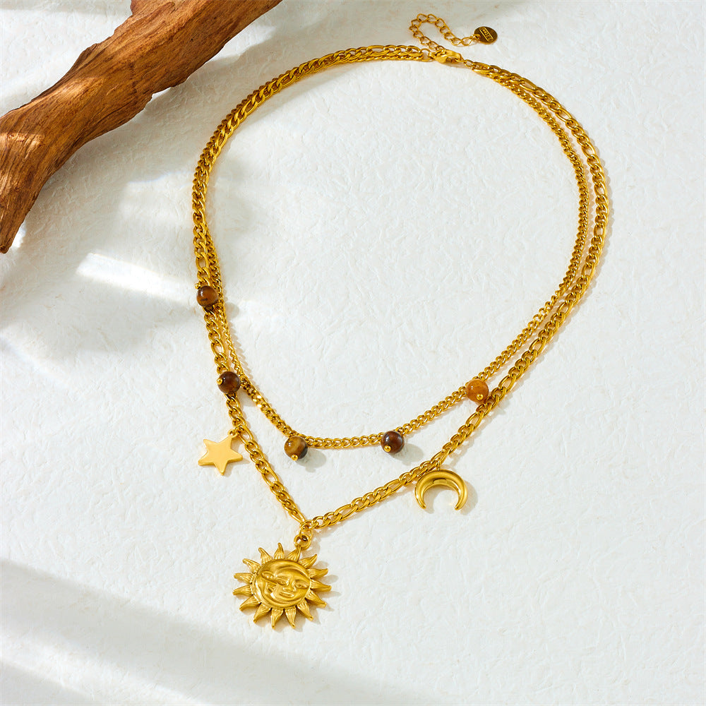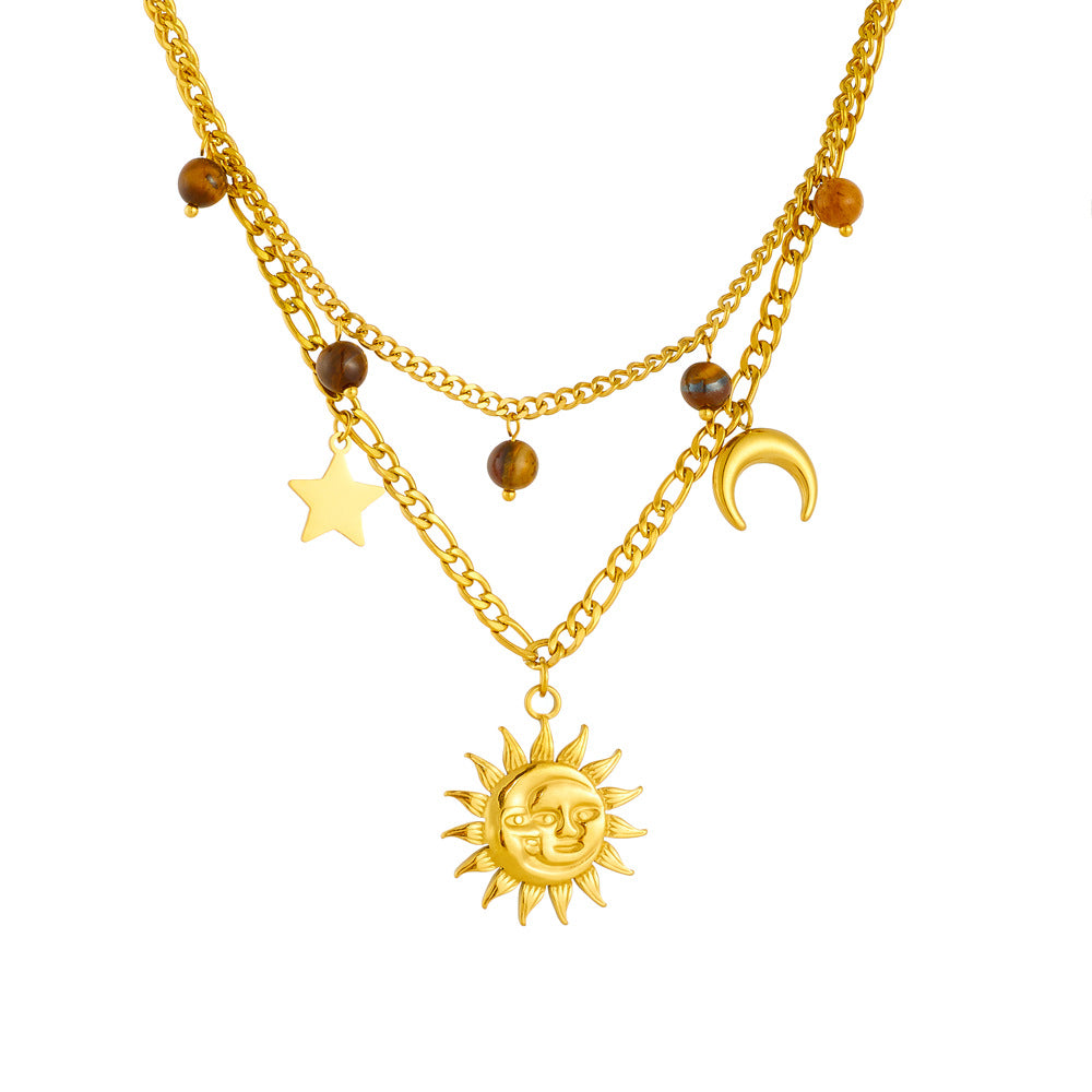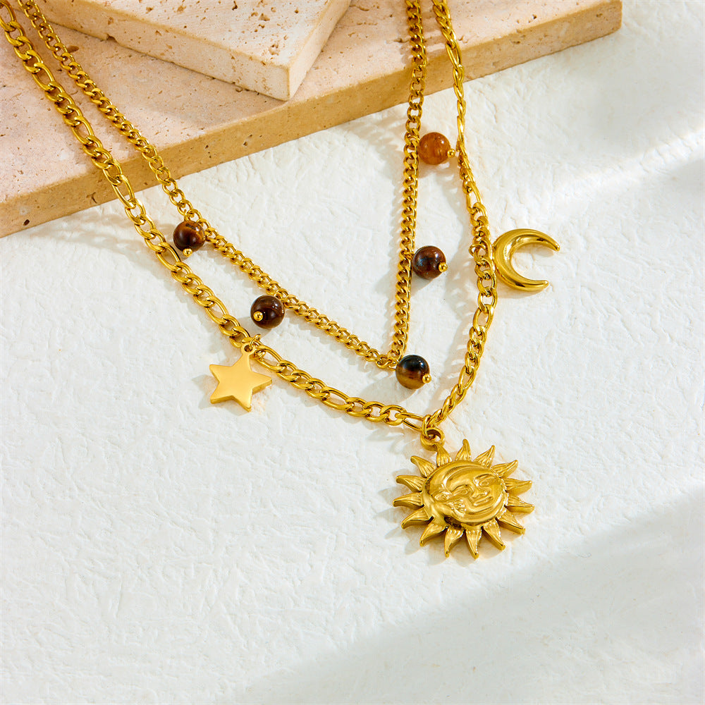 Gold-Plated Human Face Sun Star Moon Pendant Double Thick Chain Vintage Tiger Eye Stone Accessories Necklace