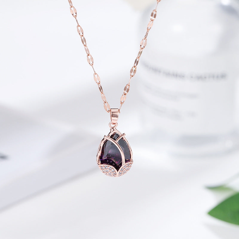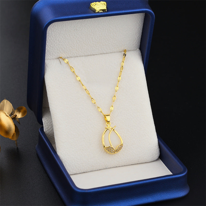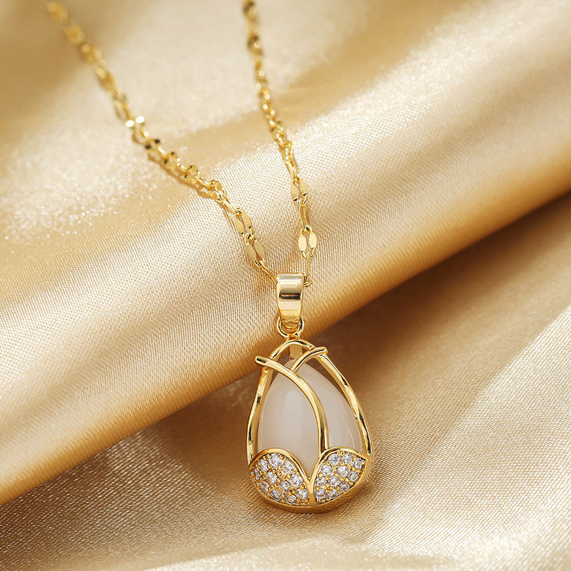 Golden Tulip Titanium Steel Necklace Female Fashion Clavicle Necklace Trendy Female Micro Inlaid Cat’S Eye Stone Full Diamond Accessories