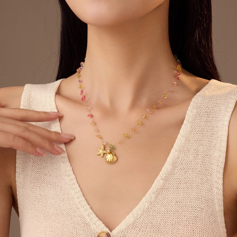 Hawaiian Vacation Starfish Shell 304 Stainless Steel Natural Stone Zircon Plating Pendant Necklace