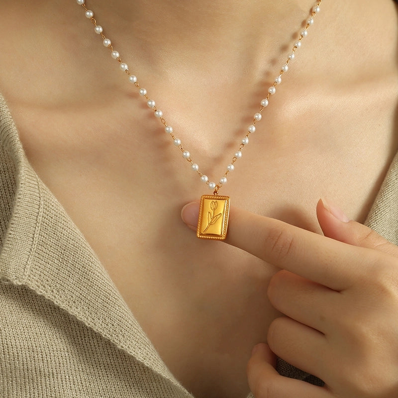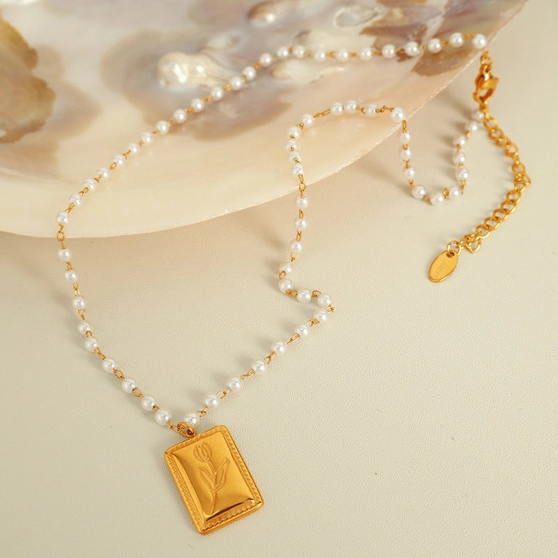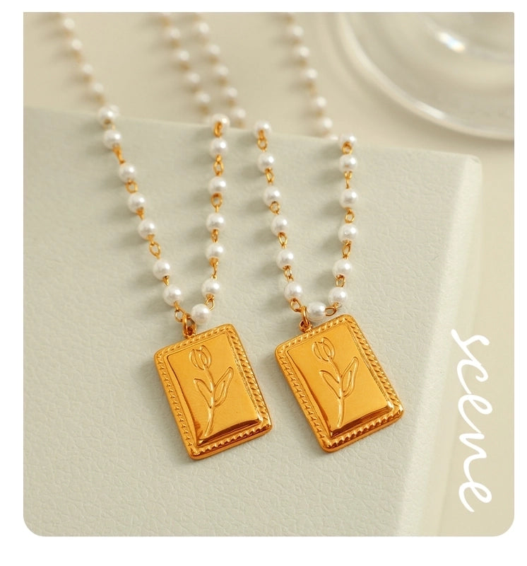 IG Style Elegant Princess Tulip Rectangle 304 Stainless Steel 18K Gold Plated Polishing Pearl Pendant Necklace