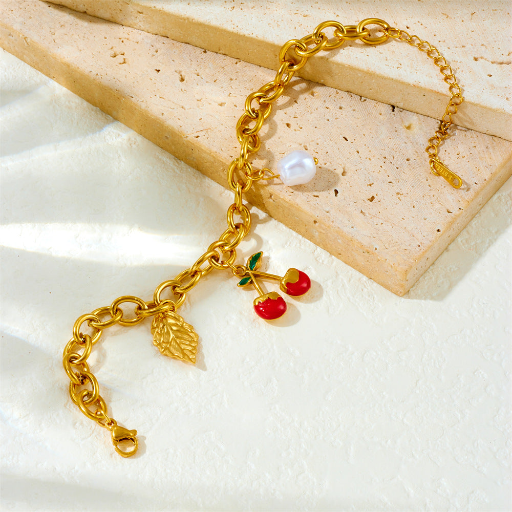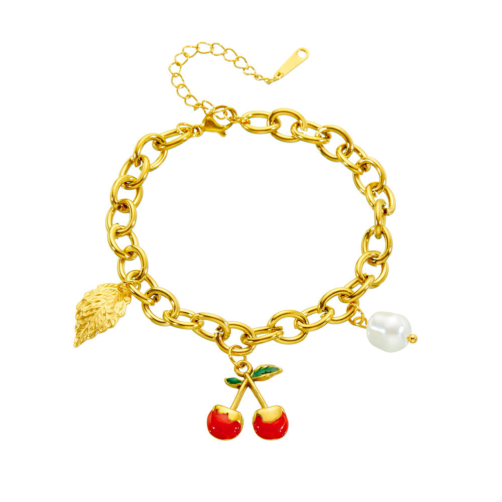 Korean Style Diy Fruit Leaf Pearl Pendant Stainless Steel Thick Chain Hand Jewelry Bracelet
