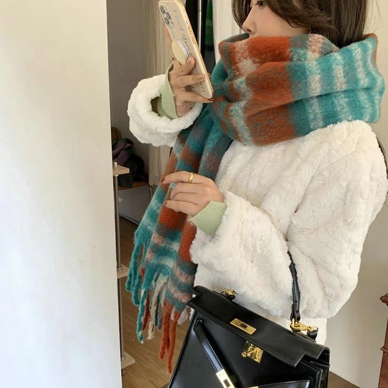 Korean-style Rainbow Plaid Tassel Mohair Scarf Autumn And Winter Thickened Student Warm Scarf For Women