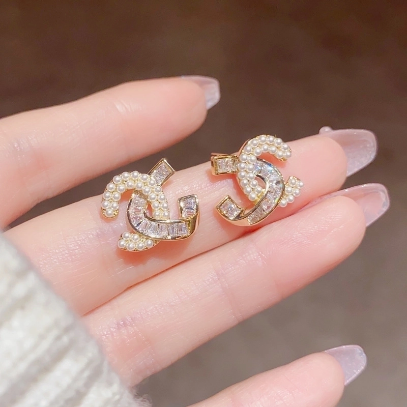 Korean Version Of Exquisite Micro Inlaid Pearl Letter Earrings Temperament Small Fragrant Style Design Silver Pin Earrings Earrings