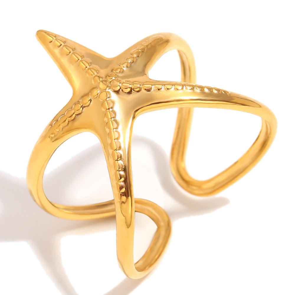 Personality Exaggerated Design Ocean Style Stainless Steel 18K Gold Plated Starfish Open Ring For Women