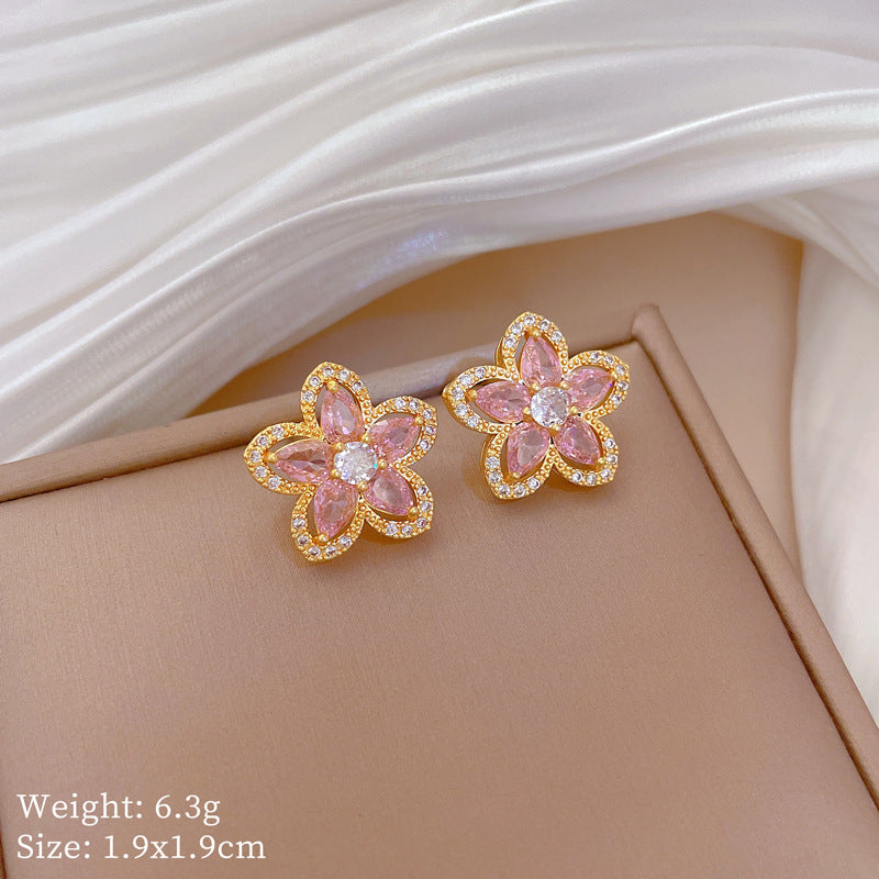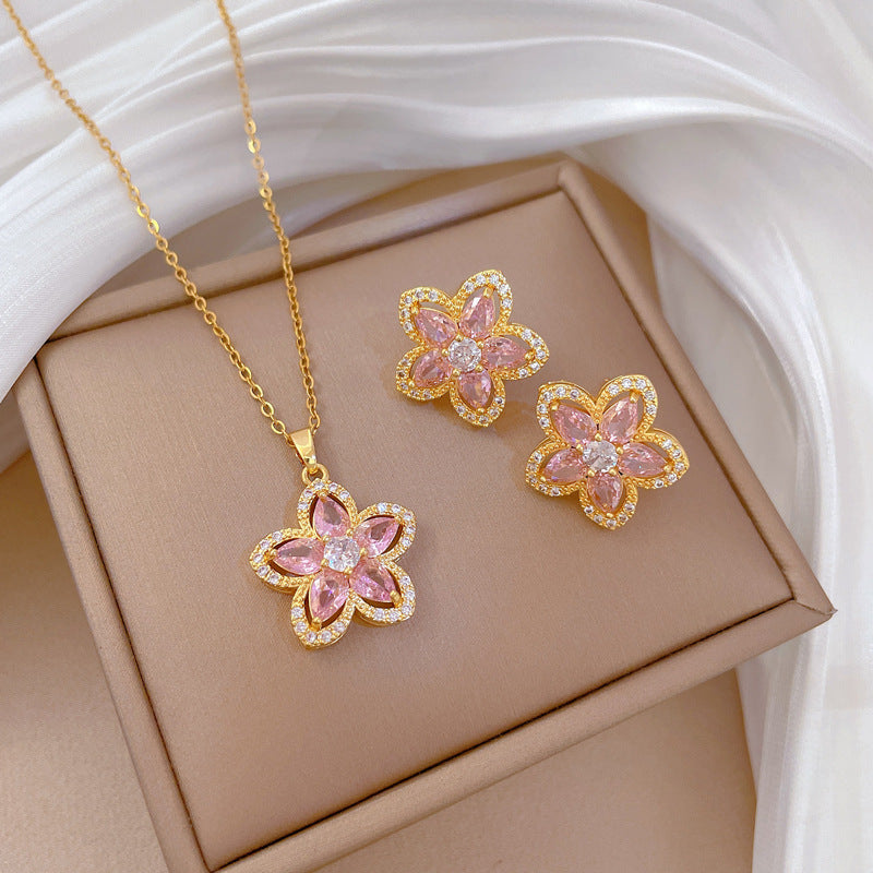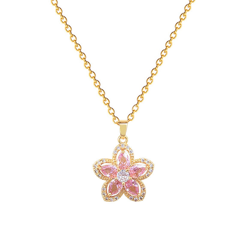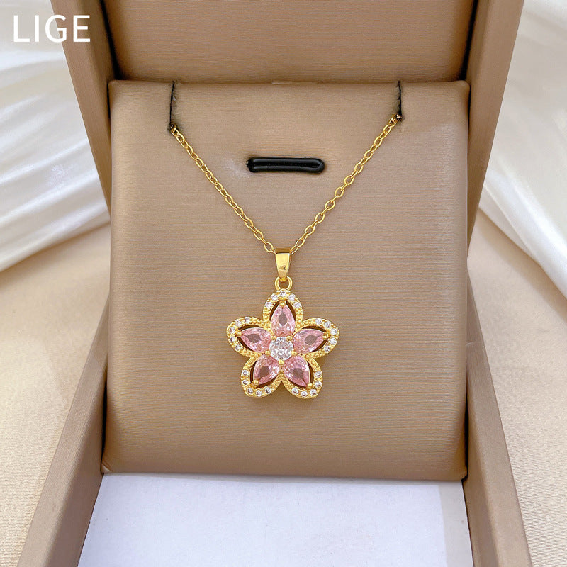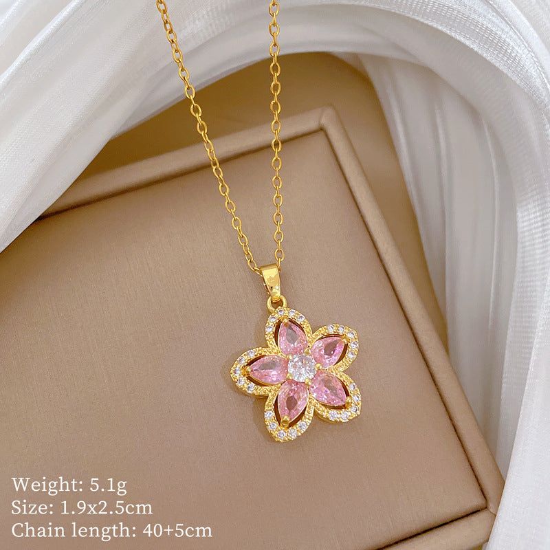 Pink Five-Petal Flower Full Diamond Gorgeous Full Diamond Necklace Female Versatile Clavicle Chain Titanium Steel