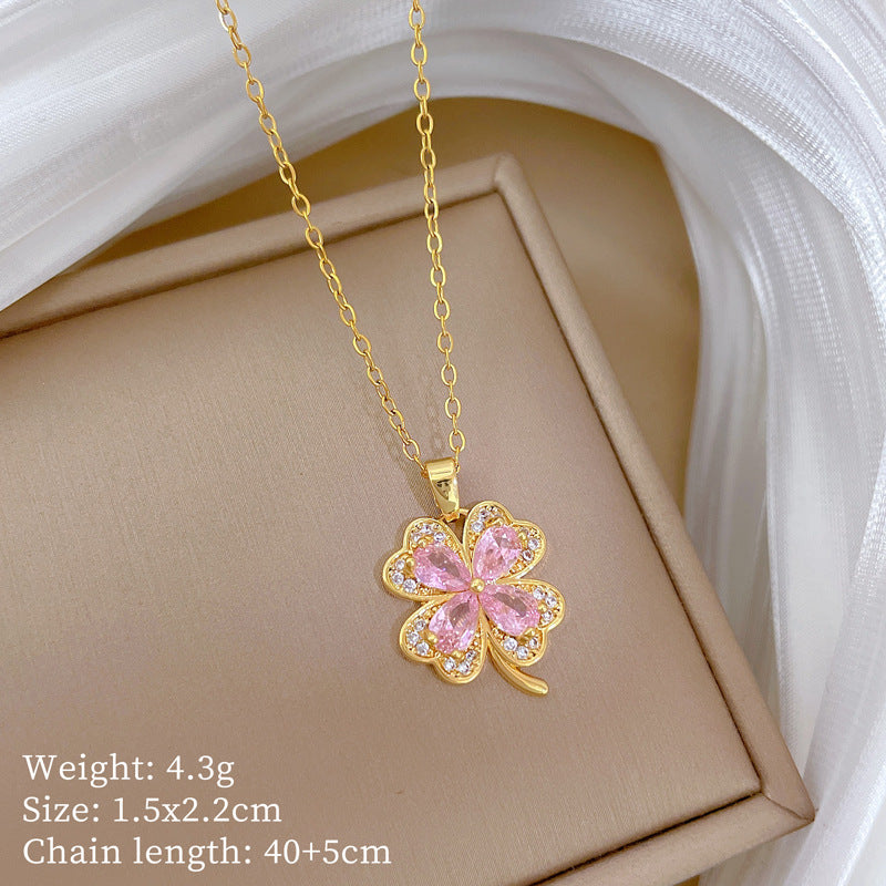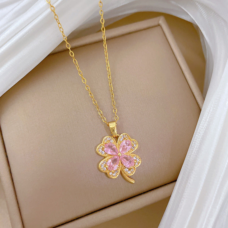 Pink Lucky Clover Full Diamond Gorgeous Full Diamond Necklace Female Versatile Clavicle Chain Titanium Steel