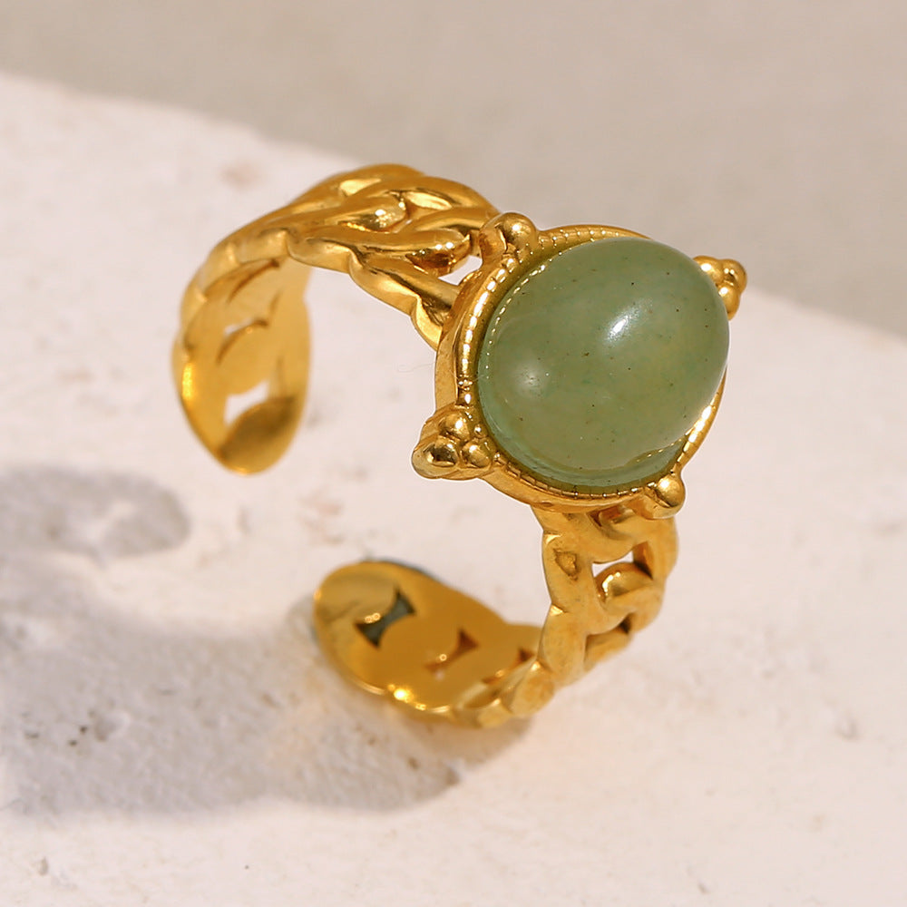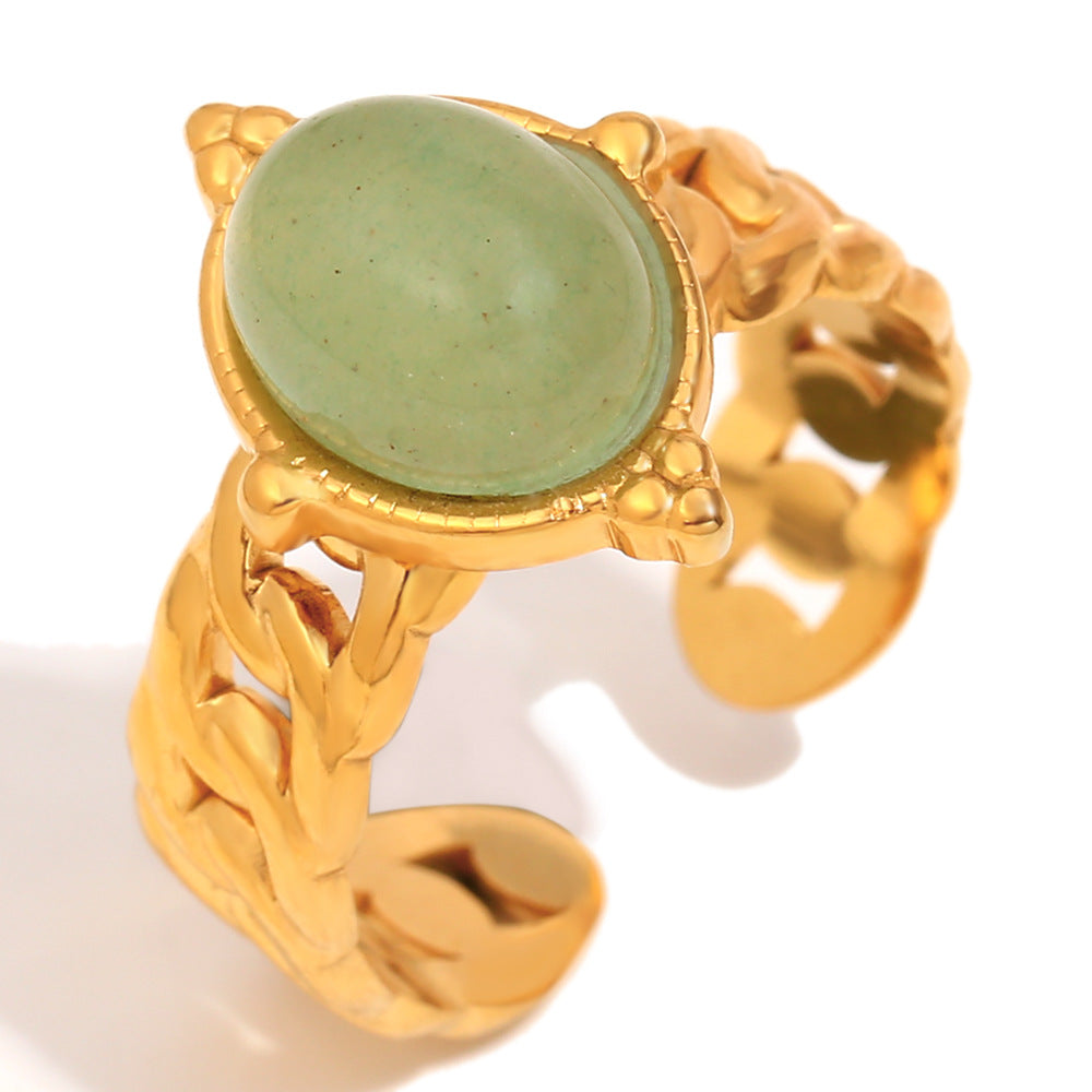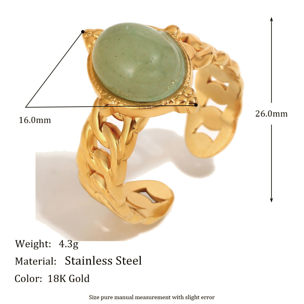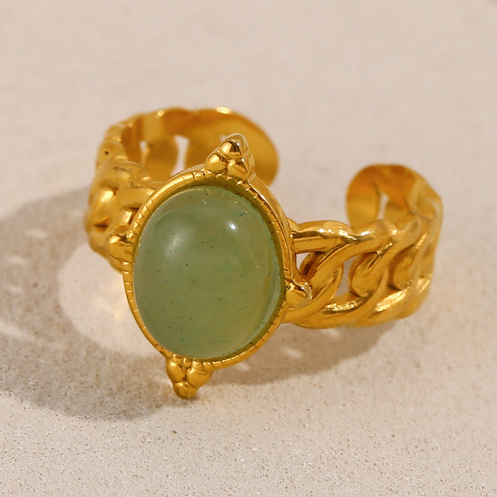 Retro French Style Oval Hand-Made Stainless Steel 18K Gold-Plated Green Aventurine Chain Open Ring