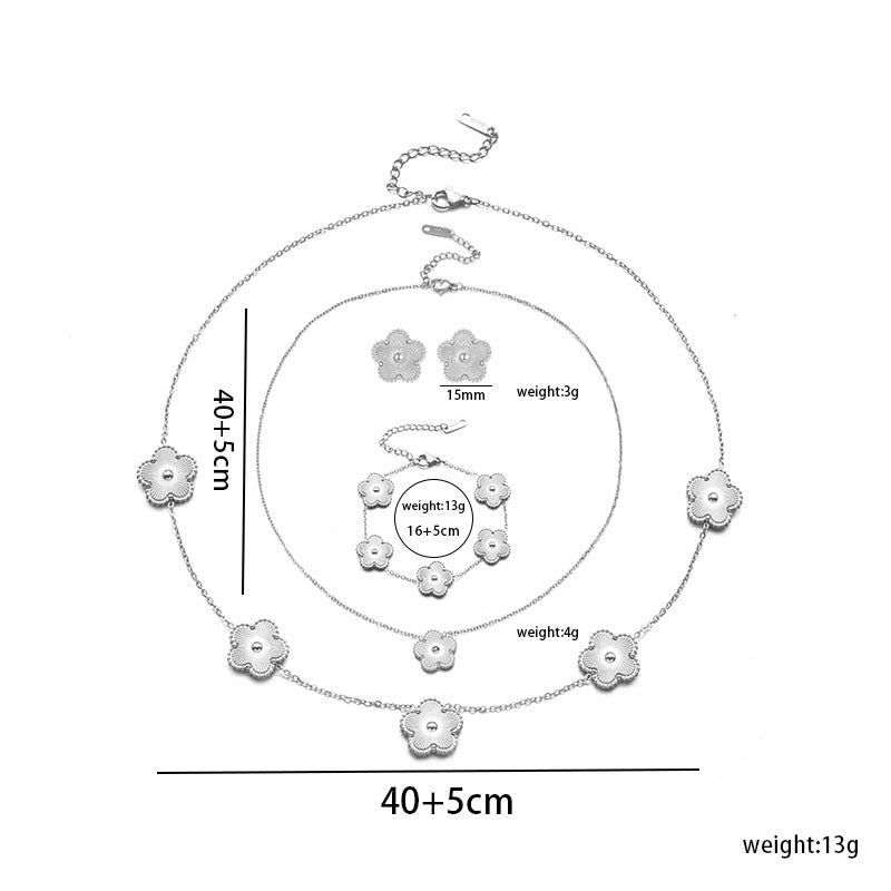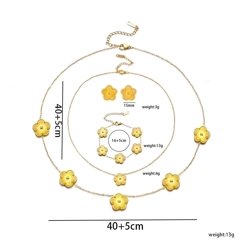 | Color | Silver Single Necklace, Silver Stud Earrings, Gold Single Necklace, Gold stud earrings, Silver Bracelet, Gold Bracelet, Silver Five Flower Necklace, Gold Five Flower Necklace, Four-Piece Silver, Four-Piece Gold |