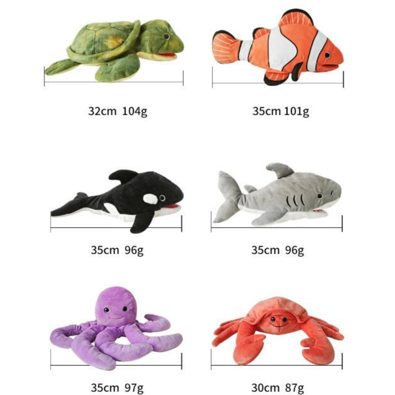 | Color | Shark, 35cm, Tortoise, 35cm, Killer Whale, 35cm, Clownfish, 35cm, Octopus, 35cm, Crab, 35cm |