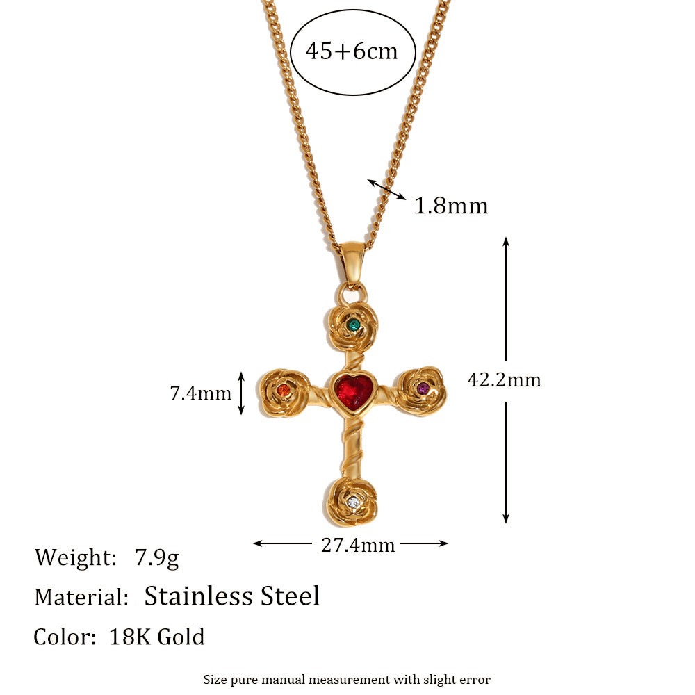 Vintage High-End Necklace Stainless Steel Plated 18K Gold Diamond Rose Cross Pendant Earrings