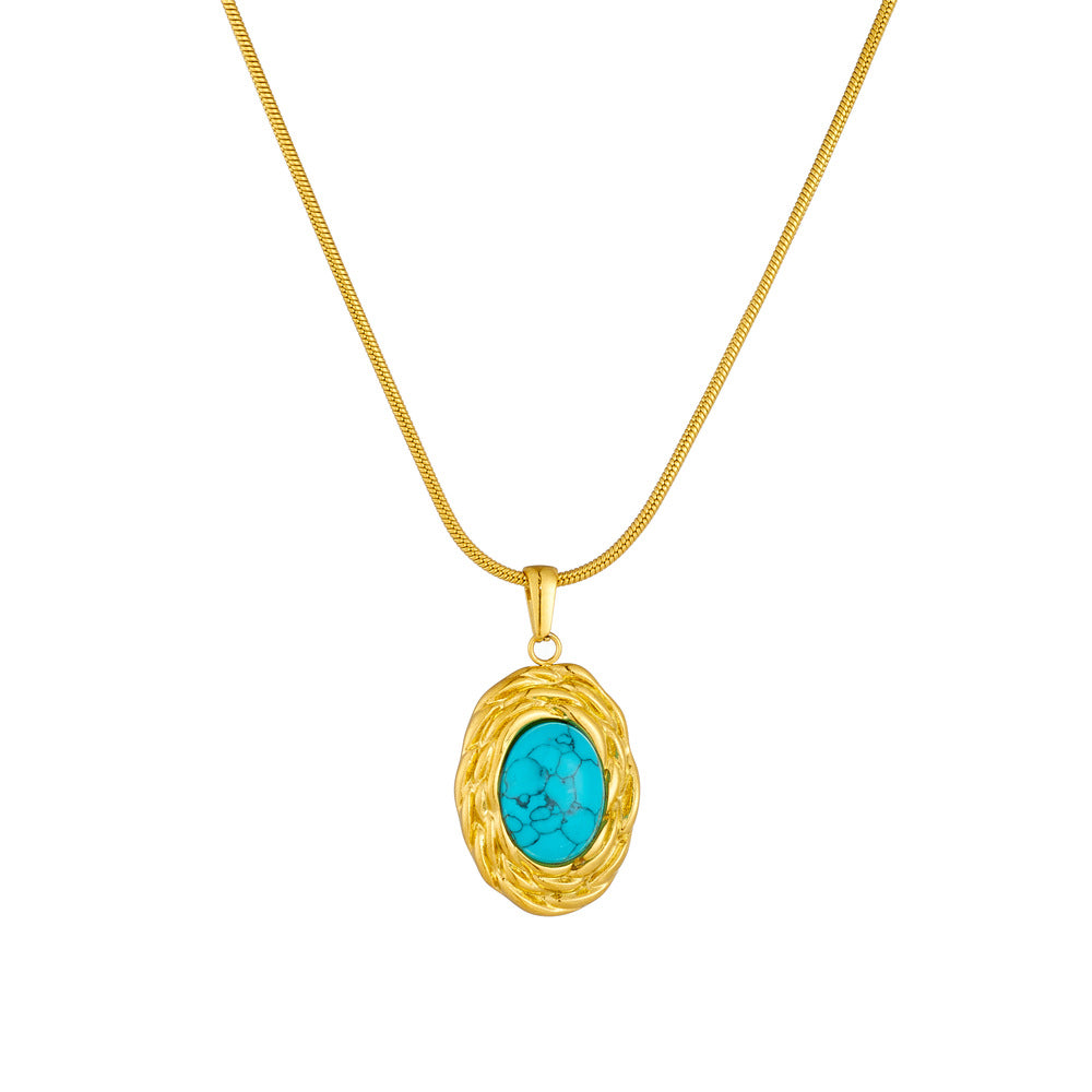 Vintage Oval Blue Turquoise Geometric Pendant Snake Bone Chain Stainless Steel Gold-Plated Necklace