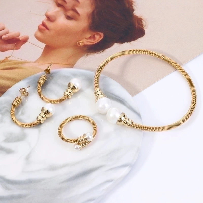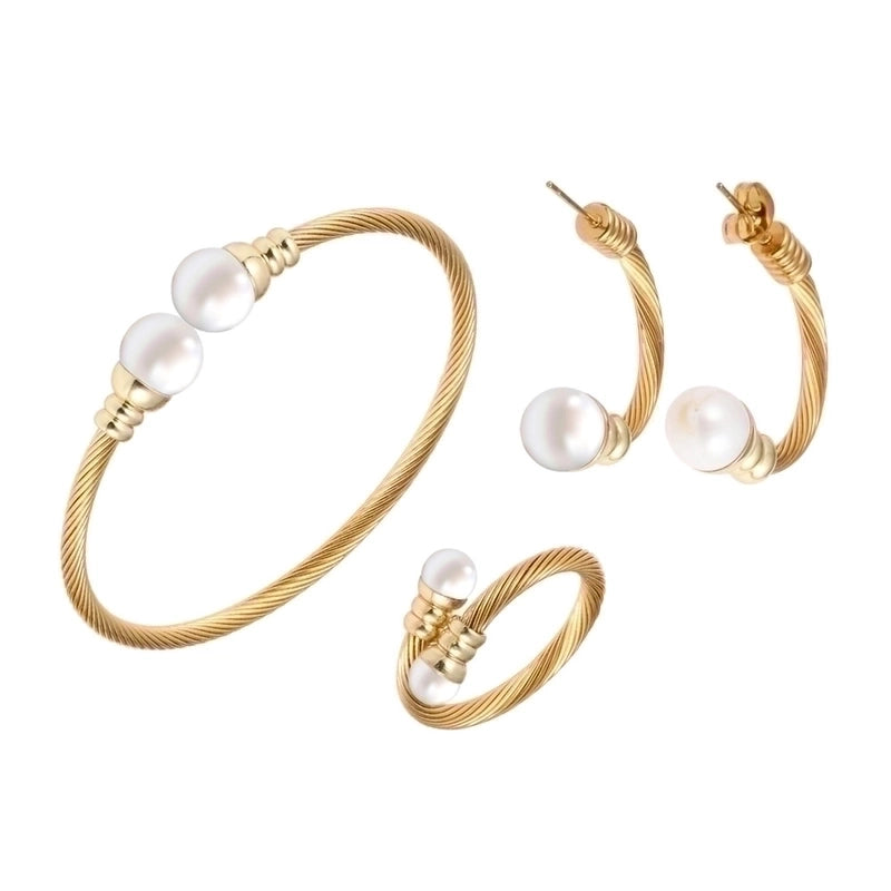 Casual Minimalist Spiral Stripe Stainless Steel Copper Braid Inlay Pearl Rings Bracelets Earrings