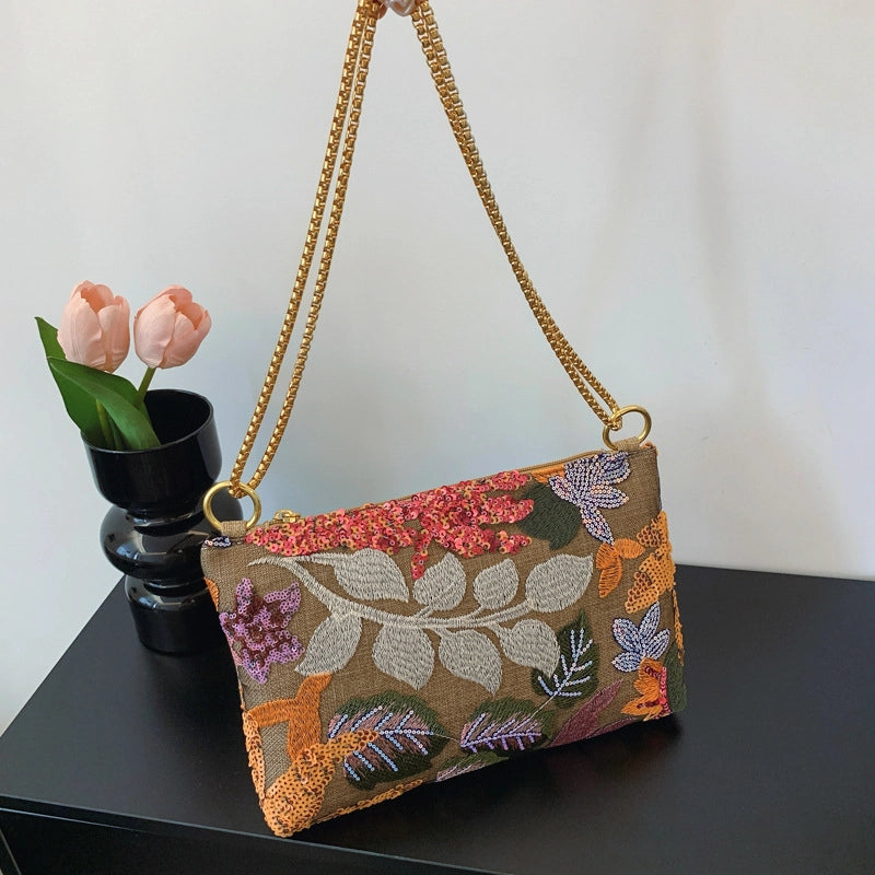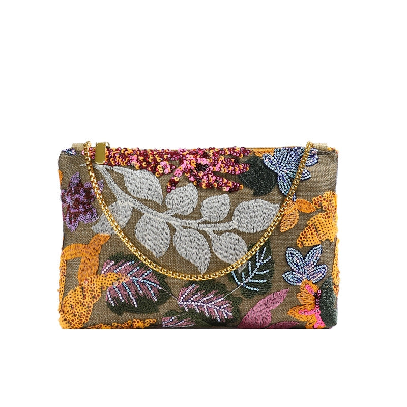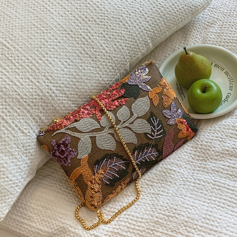 Women’s Medium PVC Cloth Leaves Vintage Style Square Zipper Evening Bag Underarm Bag
